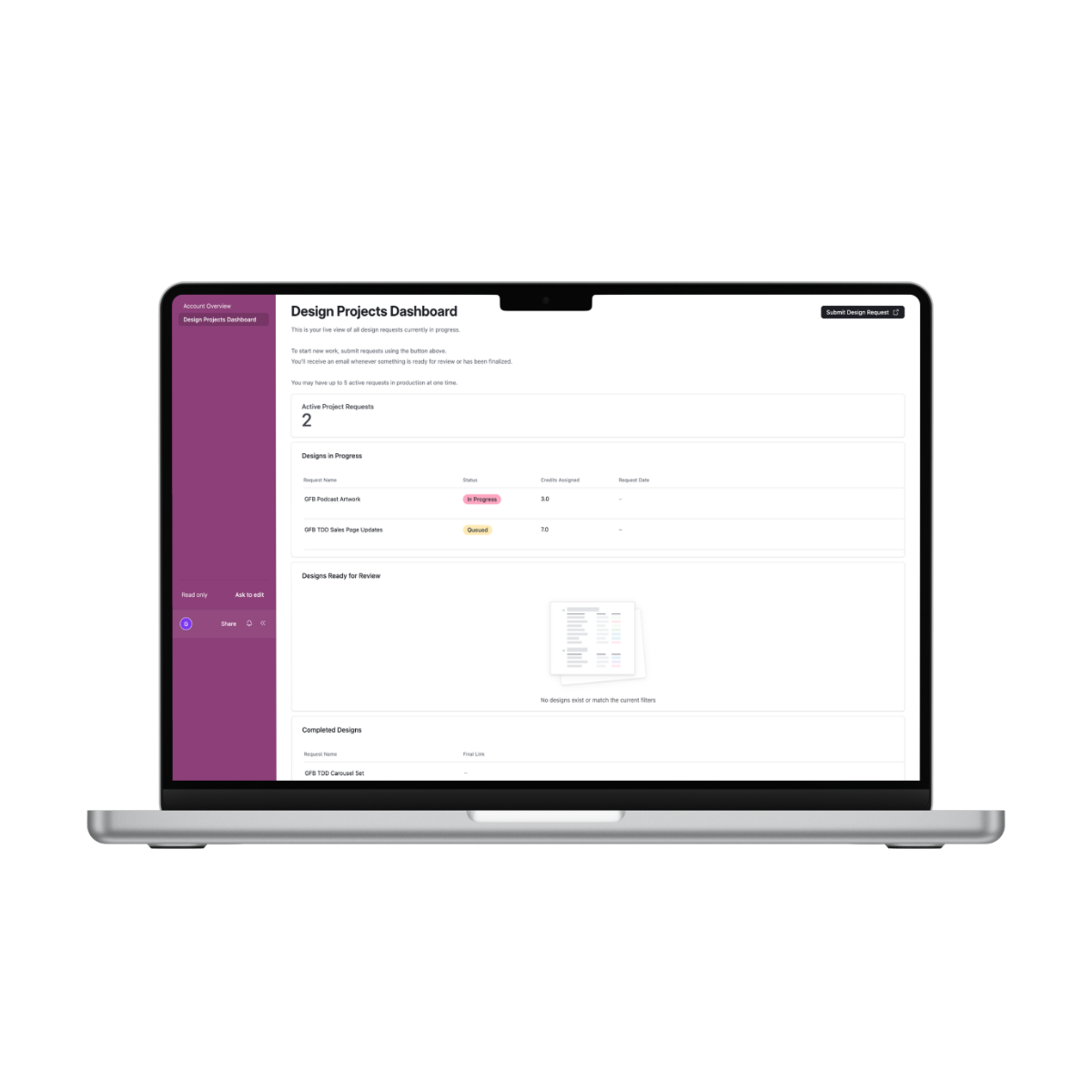 A dedicated space to submit requests, track progress, review designs, and access final assets.